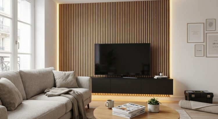 À force de voir ce mur blanc, l’ambiance de mon salon me déprimait. Jusqu’au jour où un panneau tasseaux bois Castorama en promo a tout changé.