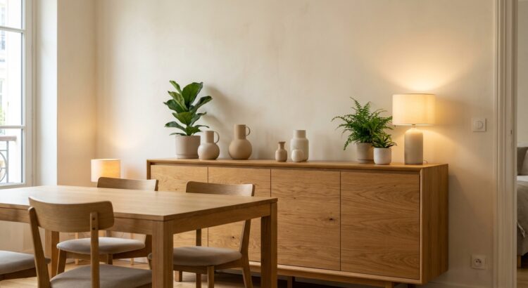 Un buffet façon chêne qui réchauffe la salle à manger sans l’encombrer