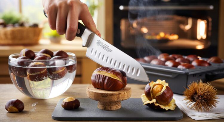 Beaucoup optent pour un petit couteau d’office et cisèlent la coque dans la précipitation. Mauvaise idée. Choisissez une grande lame éminceur, bien stable, et placez chaque châtaigne sur un support antidérapant, comme un petit bouchon de bouteille. On limite les glissades et les doigts sont en sécurité.