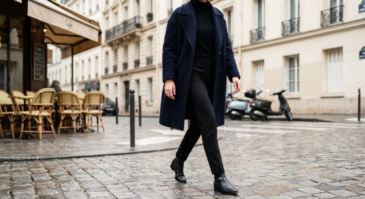 Au bureau, un pantalon à pinces bleu marine, un col roulé noir et un blazer noir dessinent une silhouette ultra professionnelle sans tomber dans l’uniforme triste. En soirée, une robe en satin bleu nuit sous un manteau noir oversize, portée avec des sandales métallisées, crée une allure dramatique mais très facile à vivre.