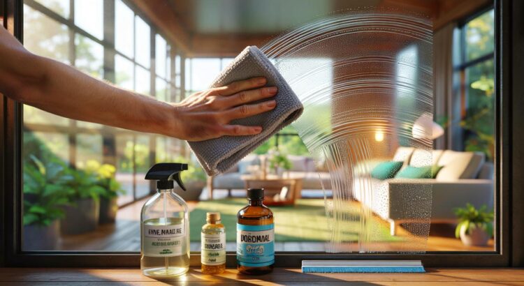 Dans un flacon spray de 500 ml, verser 250 ml d’eau déminéralisée, 200 ml d’alcool ménager 70° (isopropylique ou éthanol) et 50 ml de vinaigre blanc. Ajouter 1 goutte de liquide vaisselle non parfumé si les vitres sont grasses. Secouer doucement. Pulvériser très légèrement sur la zone (brume, pas pluie). Passer une microfibre “verre” en mouvements en S, du haut vers le bas. Prendre un second chiffon microfibre sec et lustrer sans appuyer. Sur grandes surfaces, finir à la raclette en bandes verticales, puis un coup de chiffon sur les bords. Étiqueter le flacon et garder à l’écart d’une source de chaleur.