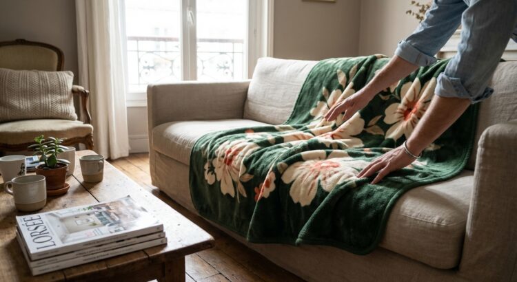 Ce type de pièce forte change aussitôt la lecture du salon. Un canapé basique semble soudain choisi pour son style, surtout si l’on garde autour de lui des lignes simples, des matières naturelles et quelques éléments sobres. Cette règle d’équilibre évite l’effet cheap souvent redouté avec les motifs floraux. Le plaid devient alors l’élément qui donne le ton, sans écraser le reste.