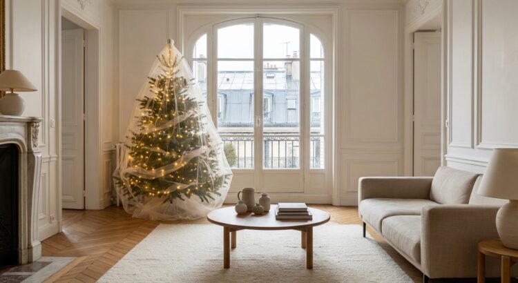 Le sapin voilé, ou veiled Christmas tree, recouvre l’arbre d’un simple voile de tulle clair qui laisse passer la lumière et floute les décorations. Née dans les concept stores parisiens et largement relayée sur Instagram et TikTok, cette déco romantique promet un salon plus calme, presque onirique. Reste une question : ce sapin presque nu remplace-t-il vraiment les décos flashy ?