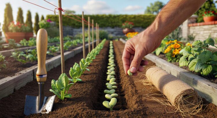 Côté sol, préparez large et léger. Une terre bien ameublie, drainante, enrichie si besoin avec un compost mûr, suffit. Semez en lignes espacées de 40 cm, puis placez un grain tous les 15 à 20 cm à environ 5 cm de profondeur. Ce geste simple donne une levée homogène et des plants robustes. Pour aller plus vite, optez pour des variétés hâtives comme Aguadulce à très longue cosse ou Express, connues pour leur entrée en production rapide.