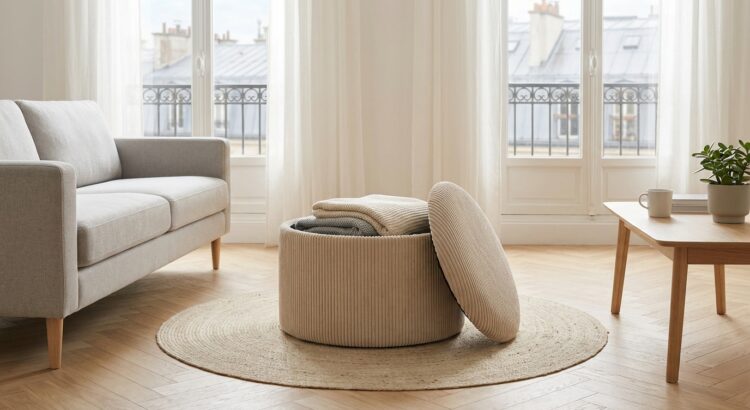 Pour un rendu harmonieux, le beige se marie bien avec un tapis en fibres naturelles et des coussins en laine, tandis que le blanc éclaire un coin lecture avec un plaid texturé posé à proximité. Certains ajoutent un plateau rigide sur le dessus pour le transformer ponctuellement en petite table d’appoint pour une tasse ou un livre.