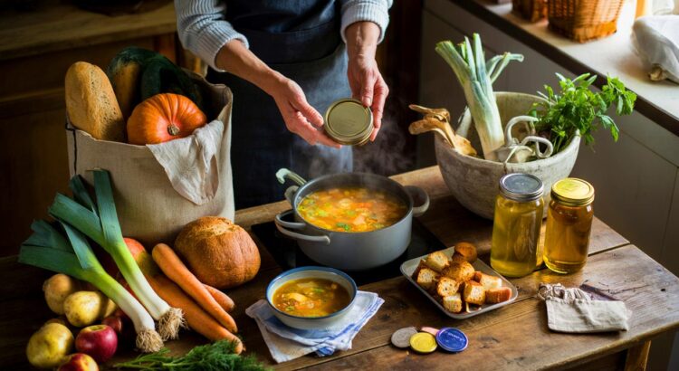 Dans bien des foyers, le **bouillon maison** redeviens l’allié numéro un. On couvre d’eau des épluchures bien lavées, des fanes, des tiges d’herbes et quelques os de poulet. On laisse frémir doucement, puis on filtre. Ce bouillon se garde une semaine au réfrigérateur ou passe au congélateur en petites portions. Il sert à tout: soupes, risottos, sauces, cuisson des céréales. Plus de goût, zéro additif, presque pas de coût.