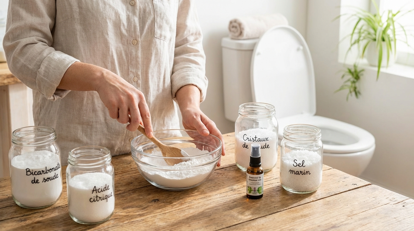 La recette repose sur quatre ingrédients de base, faciles à trouver. Le bicarbonate de soude désodorise et nettoie en douceur. L’acide citrique, d’origine naturelle, attaque le calcaire. Ensemble, ils déclenchent une réaction chimique effervescente dès qu’ils touchent l’eau. Les cristaux de soude renforcent l’action nettoyante sur les salissures, tandis que le gros sel joue l’agent grattant mécanique qui aide à décoller le tartre incrusté.