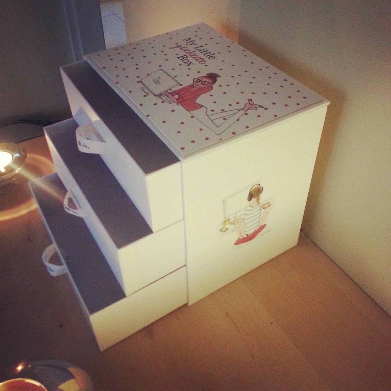 • les boîtes de My Little Box en meuble à tiroir : je suis abonnée à My Little Box sauf qu’au bout d’un certain temps, j’ai accumulé un certain nombre de boîte. Je m’en suis donc servie pour faire un petit meuble à trois tiroirs (DIY que j’avais vu sur Pinterest). Ça illustre joliment ma commode !