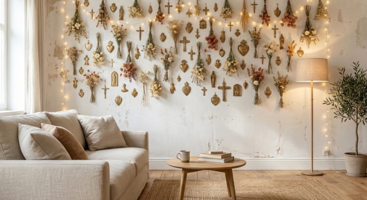 Une fois les pièces réunies, libre à vous de les disposer en grappe serrée, en ligne verticale ou façon petite constellation. Beaucoup aiment mixer ex-voto, mini-miroirs dorés, souvenirs de voyage, photo en noir et blanc et fleurs séchées : chaque objet devient un fragment de récit. Les murs français s’emplissent ainsi de cœurs sacrés, d’étoiles et d’oiseaux dorés qui reflètent la lumière des bougies et des guirlandes, pour une ambiance à la fois cosy et légèrement mystique.