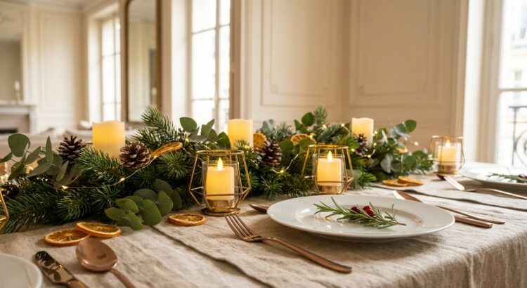 - Installer un centre de table naturel avec branches de sapin, pommes de pin blanches ou fleurs séchées, complété par quelques bougies ou guirlandes LED.