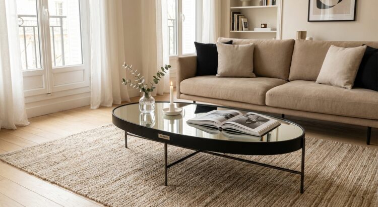 CAMELIA s’adresse autant aux petits salons urbains qu’aux séjours plus spacieux. Dans un studio ou un séjour de taille modeste, son plateau miroir agrandit visuellement l’espace et sa forme ovale évite les coins agressifs, pratique avec des enfants qui jouent autour du canapé. Dans un intérieur plus grand, elle fonctionne très bien sur un tapis berbère écru, un parquet ancien ou un sol béton pour accentuer l’esprit loft. Un livre d’art, une bougie généreuse et un vase posé sur le plateau suffisent à composer un coin détente qui ressemble aux pages d’un magazine déco, sans avoir eu besoin de changer tout le mobilier.
