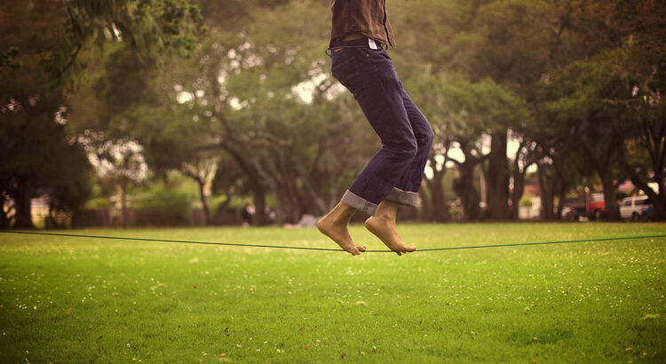 Dans la série d’activités étranges que je tente parfois, j’ai testé le slackline, une discipline pour le moins originale qui consiste à jouer les funambules sur une corde élastique dressée entre deux arbres et tout simplement marcher dessus.