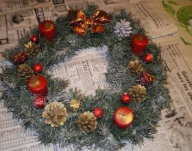 – une couronne en faux sapin de 45cm de diamètre- des pommes de pin de petite taille (environ 7)- une bombe de fausse neige- une bombe de couleur or- un rouleau de ruban rouge et or (sinon un paquet de petits flots déjà faits rouge ou or)- un paquet de petits cadeaux rouges et or- un paquet de petites boules rouges- 4 bougies rouges de taille moyenne- colle liquide universelle- éventuellement des cure-dents pour faire tenir les paquets cadeaux