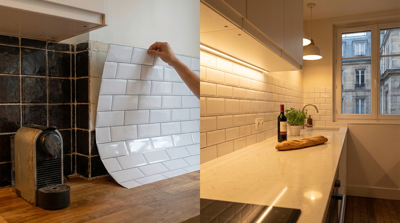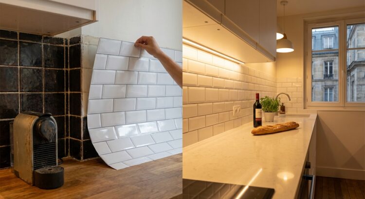 Une nouvelle génération de revêtements, des carreaux adhésifs en relief aux panneaux lisses inspirés des cuisines d’hôtels, permet de recouvrir l’existant sans sortir une perceuse. Le principe : habiller le vieux carrelage ou le mur peint comme une seconde peau, pour gagner en lumière, en style et en facilité de ménage.