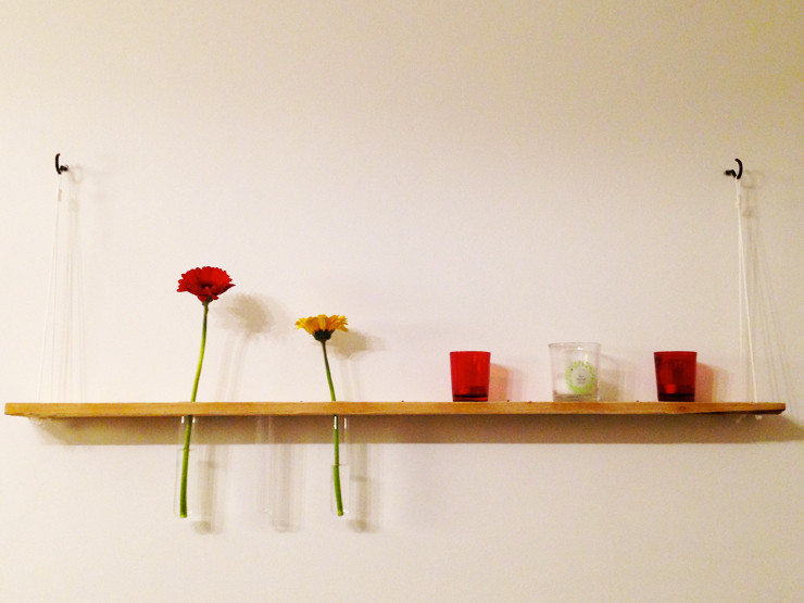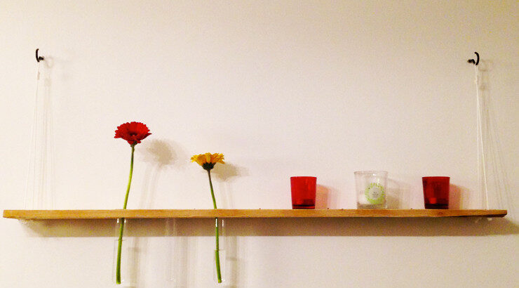 Fixer les crochets au mur à l’aide d’une perceuse et de chevilles. Accrocher votre étagère, insérer vos éprouvettes, mettre de l’eau, des fleurs et des petits cadres, des bougies ou des bibelots et admirer !
