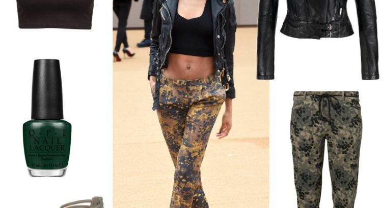 Jourdan Dunn met en valeur son pantalon camouflage avec une veste en cuir perfecto. Son crop top noir féminise son look avec efficacité.