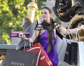 La Show off (à gauche) – Il se pourrait bien que la robe phare du tournage parisien soit cette robe violette. Comme son nom l’indique elle émerveille et c’est bien sûr pour faire son shopping avenue Montaigne que Blair l’a choisie !