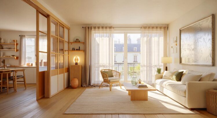 Pas besoin d’abattre la moitié de l’appart pour tourner la page de la verrière. On peut redessiner l’espace avec des paravents en bois ajouré, un claustra qui laisse passer les rayons, ou des étagères ouvertes qui matérialisent une zone sans bloquer la clarté. Les portes coulissantes vitrées bordées de bois clair gardent l’intimité tout en laissant filer la lumière.