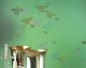 Les papillons jouissent actuellement d’un certain engouement, en partie grâce à des couturiers, dont les somptueux imprimés s’ornent de papillons et de plumes fragiles. J’ai ici choisi des couleurs aux tons assez proches pour définir un motif subtil, mais on peut imaginer des papillons noirs sur un mur rose pâle et, pourquoi pas, des papillons violets scintillants sur un mur violet.