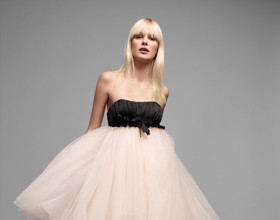 Le visuel d’ouverture met en avant la robe bustier en tulle et en satin duchesse de la collection Black Carpet Paule Ka qui est disponible à 1 650 euros. www.pauleka.com