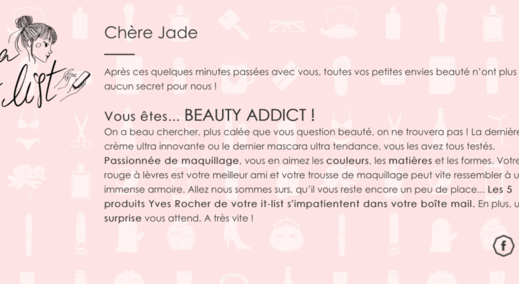 Si je reviens au sujet de l’article, (vive les digressions) le site s’appelle « [ez_link target=’_blank’ url_id=’21997′ ]ma-itlist.com[/ez_link] » c’est comme si on envoyait une vendeuse Yves Rocher directement dans votre ordinateur. En gros, ce site beauté permet de définir notre profil beauté et ensuite 5 produits qui ressemblent à notre fameux profil sont proposés. Pour cela, il faut répondre à 5 questions, pas plus 🙂