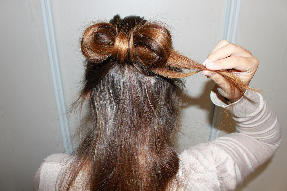 Etape 2 : Je crée la base du nœud en formant une boucle de cheveux à l’aide de l’élastique, et laisse le reste de la mèche sur le devant.