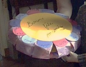 Collage et assemblage :Coller les pots de yaourt sur les douze petits cercles du papier le plus épais puis remplir chaque pot d’une surprise. Découper douze bandes de la largeur d’une pétale et d’environ 15cm de long. Agrafer chaque bande au dessous de chaque pétale du papier le plus épais puis rabattre la bande de papier de soie sur tous les pots. Coller ensuite le dessus de la fleur et faire inscrire « bonne fête mamie ».