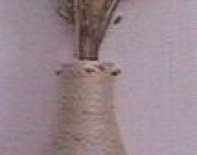 Décorer la ficelle avec des perles. Première solution : enfiler des grosses perles de bois. Pas facile et ça fait un décalage au niveau de la perle, la corde n’adhère pas à la bouteille. Cependant, si on en met peu, ça rend bien. Autre solution, enfiler des perles de bois sur du fil de pêche et en les laissant à bonne distance les unes des autres, enrouler le fil sur une partie de la bouteille. Alexia a donc fait ainsi et a ajouté ses perles, blanches, après avoir fini l’enroulement de la corde. La difficulté était donc de faire tenir les extrémités du fil de pêche en les passant (avec un petit morceau de scotch) sous la corde déjà en place. L’inconvénient est que l’on voit ainsi un peu le fil transparent. une autre méthode : j’ai collé mon fil de pêche et ses perles avant…