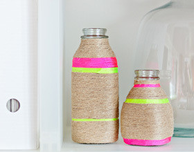 On adore le filet de lumière néon qui entoure délicatement les vases homemade de Laura Parke, la blogueuse de « A Girl who Makes.com« . La décorista créative a utilisé des bouteilles de lait en verre qu’elle a habillées de cordons partiellement trempés dans des peintures qui flashent ! On les pose tels quels sur l’étagère ou on y met un bouquet de fleurs fraîches.