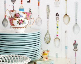 Idéal pour le tea time, ce papier peint non tissé présente une avalanche de cuillères raffinées qui semblent tout droit sorties des brocantes ou des tiroirs de mamie ! Et quand on y regarde de plus près, on aperçoit quelques clés perdues au milieu des cuillères en argent (les clés des tiroirs justement ?) !