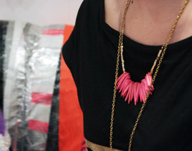 Marion : Chez moi, j’ai un mur de colliers. Toutes mes bagues sont disposées sur des tables. Je sélectionne mes bijoux en fonction de la couleur que j’ai envie de porter. Si je choisis un collier rose pétant, je le porte avec une robe noire et des bottes roses pétantes.