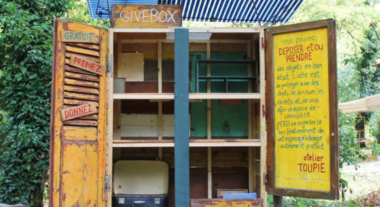 Tout droit venu de Berlin, les givebox sont des sortes d’armoires quel’on trouve dans la rue dans lesquelles sont déposés vêtements, objets,jouets , tout ce dont nous n’avons plus l’utilité mais peut toujoursservir à quelqu’un d’autre. Ces boîte-cabines sont généralement construites à partir de matériauxde récupération, faîtes de bric et de brac et en contiennent tout autant.