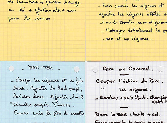 Ma grand-mère est née à Hanoï et a immigré en France dans les années 50 pour se marier avec mon grand-père. Elle a tenue un restaurant vietnamien pendant plus de 20 ans. Elle a transmis à mon père certaines de ses recettes que je reprends aujourd’hui pour mon plus grand plaisir et faire découvrir à mes filles la cuisine de mon enfance. Crevettes à la cantonaise, porc au caramel, lard aux aubergines, poisson aux petits légumes… j’ai récupéré les fiches de mon père que vous pouvez voir en illustration de cet article.