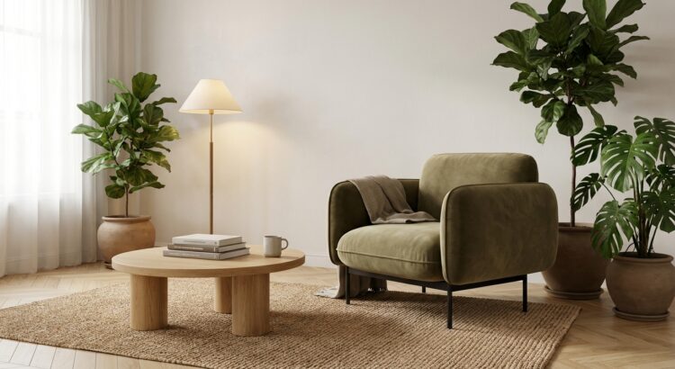Un fauteuil en velours vert kaki qui change l’ambiance du salon