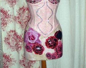 J’aime coudre, peindre, retaper de vieux meubles, alors, j’ai associé le tout mais sans utiliser la couture mais plutôt le collage. Et comme ma fleur préférée est la rose, je m’en suis inspirée pour rendre encore plus féminin ce vieux buste.