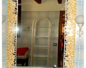 Coupez les carreaux et mettez-les dans une boîte. Coupez ensuite les petits miroirs. Collez-les avec de la colle spéciale miroir et ensuite du ciment colle pour la faïence.