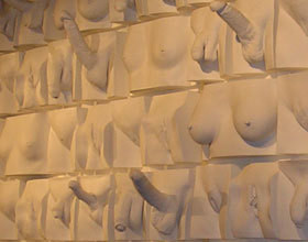Après avoir appris que le dessous du pied est une zone érogène (si si) on se retrouve face au mur des sexes. Devant nous se dressent fièrement pénis, seins et vagins en plâtre.