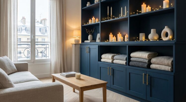 Quand l’étagère est repeinte et équipée, il reste à jouer la carte de l’ambiance « chalet chic ». L’hiver invite à multiplier les sources de lumière douce : bougies parfumées en cire naturelle et guirlande LED fine enroulée autour d’un montant. On ajoute un peu de poterie brute, quelques tissages en laine et une corbeille de pommes de pin ou d’oranges séchées. Le secret consiste à ne pas surcharger, à créer des groupes impairs et à laisser des espaces vides pour que l’étagère devienne vraiment la star de la pièce.