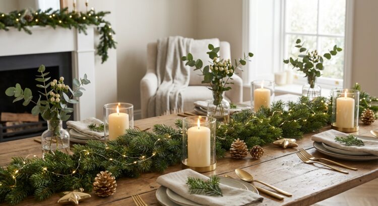 Une guirlande de sapin, naturelle ou artificielle, apporte immédiatement relief végétal, volume et convivialité. Posée en serpentin au milieu de la table, ou enroulée autour d’un vase ou d’un cercle métallique, elle crée ce côté nature très recherché, surtout associée à du verre transparent, du métal doré ou noir et quelques bougies. Réutiliser ce que l’on a déjà devient aussi un geste malin pour une déco responsable.