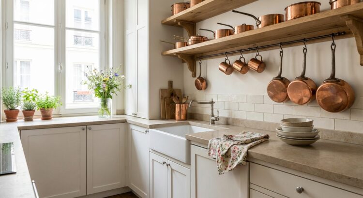 Dans une cuisine devenue véritable pièce de vie, ces ustensiles en cuivre suffisent parfois à tout changer sans travaux. Sur un mur clair, une barre métallique accueillant trois casseroles crée un effet vitrine. Autour du plan de travail, un mug devient pot à ustensiles, des louches se suspendent, de mini casseroles accueillent des herbes ou des bougies.