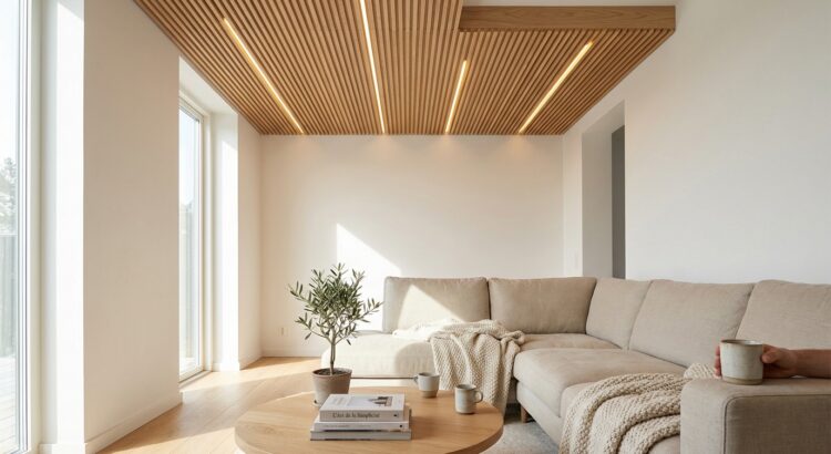 - Le plafond en bois moderne joue sur les tasseaux, les essences claires et la lumière intégrée pour changer l’ambiance sans engager de gros travaux.
