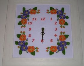 – toile à broder + fils- mécanisme d’horlogerie- cadre