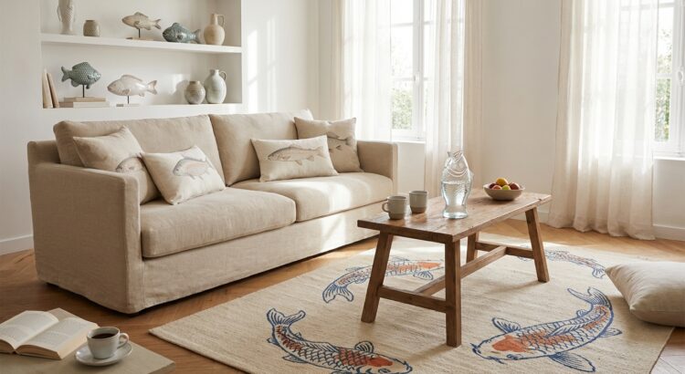 Pour les budgets plus serrés, les textiles font merveille : housses de coussin brodées, torchons poisson en cuisine, tapis carpes koï près du lit, fauteuil de jardin style French Riviera avec assise imprimée. Une affiche minimaliste représentant un banc de poissons au-dessus du canapé ou du lit termine l’histoire. De quoi transformer l’atmosphère en un week-end, sans toucher aux murs ni au mobilier de base.