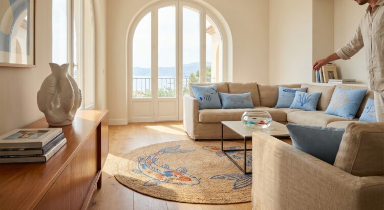 Dans le salon, Pinterest plébiscite les pièces fortes. Un tapis en laine évoquant des carpes Koï devient le point de départ du décor, entouré d’un canapé écru habillé de coussins brodés de poissons. Sur le mur, une affiche de banc de sardines ou un miroir en forme de poisson suffit à donner le ton, sans transformer la pièce en décor de station balnéaire.