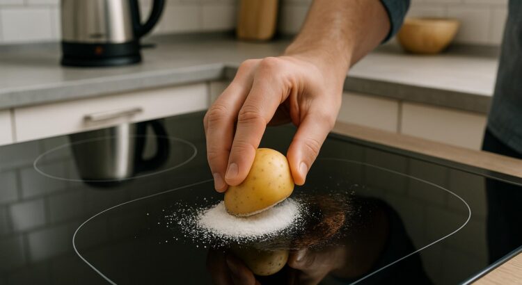 Pour tester cette astuce, il suffit d’une pomme de terre moyenne, de deux cuillères à soupe de sel de table, d’un peu d’eau bouillante et d’un chiffon doux ou d’une microfibre. Sur une plaque éteinte, on verse un mince filet d’eau très chaude sur les zones brûlées : la chaleur réveille les graisses figées et commence à dissoudre les sucres caramélisés. On attend ensuite que la surface soit simplement tiède.