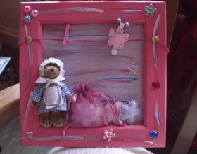 – cadre en bois 20 x 20 cm- peinture acrylique + peinture 3D+colle- cordon de couleur+2 gros clous or + petites pinces à linge- ourson et éléments de récup