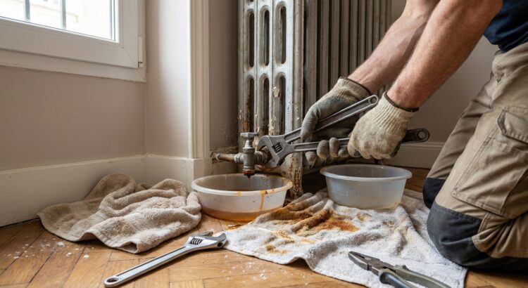 Avant de toucher aux écrous, identifiez le type de radiateur : à eau chaude, électrique ou fonte ancienne. Sur un circuit collectif, la vigilance s’accentue autour des robinets de coupure et du point de vidange ; en cas de doute, mieux vaut appeler le chauffagiste. Dans tous les cas, laissez l’appareil refroidir puis protégez sols et plinthes avec serpillières, serviettes épaisses ou bâche imperméable.