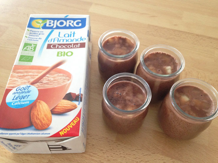 Une recette toute simple mais efficace : les petits pots au lait d’amande chocolat et poires.