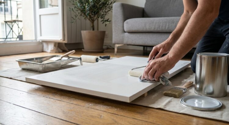 Pour préparer un meuble en mélaminé, un simple coup d’éponge ne suffit pas. On commence par un lavage à l’eau tiède et au savon de Marseille, qui élimine poussières et salissures. Puis vient le dégraissage, étape clé pour repeindre un meuble sans poncer : un chiffon imbibé d’alcool ménager ou de vinaigre blanc chasse les résidus de gras et de produits. Le meuble est ensuite rincé à l’eau claire, puis laissé à sécher, à l’abri des courants d’air.