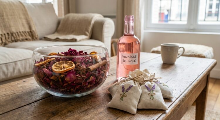 Placée dans une jolie coupe au salon ou dans l’entrée, cette préparation diffuse une fragrance douce, loin des effluves agressifs des aérosols. On peut même renforcer l’effet en ajoutant quelques gouttes d’huile essentielle de bois de rose. Le résultat : un pot-pourri dépolluant qui masque moins les odeurs qu’il n’assainit réellement l’atmosphère, tout en donnant un style un peu vintage à la pièce.